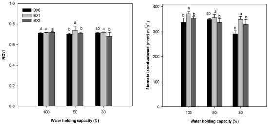 The NDVI did not change with changing soil water content, as it was above 0.6 for all treatments. Under optimal watering, Xcell Boost did not have any effect on the NDVI values. Application of BX1 on the plant under 50% WHC treatment led to significantly increased NDVI. A reduction in stomatal conductance was evident under the 30% WHC treatment (13% reduction). Application of BX1 showed the highest significant (p ≤ 0.05) increase in stomatal conductance under 30% WHC (292 to 348). The BX2 application also induced a significant (p ≤ 0.05) increase in this parameter (292 to 329), but the increase was lower than that of the BX1 treatment (Figure 2).