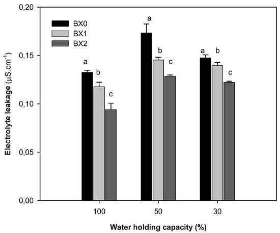 Electrolyte leakage content of spinach grown under different water and Xcell Boost levels. The values are means of four replicates ± standard error. Letters on top of bars indicate significant differences within each water treatment at p ≤ 0.05. BX0 represents no bio-stimulant, while BX1 represents single concentration and BX2 double concentration of the bio-stimulant.