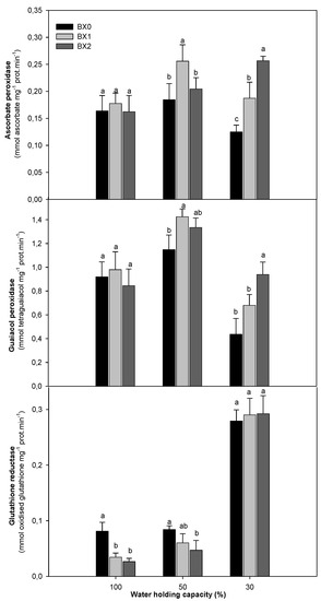 Ascorbate peroxidase activity, guaiacol peroxidase activity and glutathione reductase activity of spinach grown under different water and Xcell Boost levels. The values are means of four replicates ± standard error. Letters on top of bars indicate significant differences within each water treatment at p ≤ 0.05. BX0 represents no bio-stimulant, while BX1 represents single concentration and BX2 double concentration of the bio-stimulant.