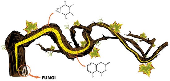 - Abou-Mansour, A.; Tabacchi, R.; Couché, E. Do fungal naphthalenones have a role in the development of esca symptoms? Phytopathol. Mediterr. 2004, 1000–1008. [Google Scholar] [CrossRef]