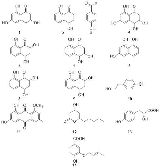 - Medentsev, A.; Akimenko, V. Naphthoquinone metabolites of the fungi. Phytochemistry 1998, 47, 935–959. [Google Scholar] [CrossRef]