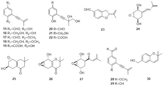 - Renaud, J.M.; Tsoupras, G.; Stoeckli-Evans, H.; Tabacchi, R. A novel allenic epoxycyclohexane and related compounds from Eutypa lata (Pers: F.) Tul. Helv. Chim. Acta 1989, 72, 1262–1267. [Google Scholar] [CrossRef]
