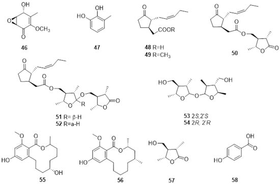 - Andolfi, A.; Maddau, L.; Cimmino, A.; Linaldeddu, B.T.; Basso, S.; Deidda, A.; Serra, S.; Evidente, A. Lasiojasmonates A–C, three jasmonic acid esters produced by Lasiodiplodia sp., a grapevine pathogen. Phytochemistry 2014, 103, 145–153. [Google Scholar] [CrossRef] [PubMed]