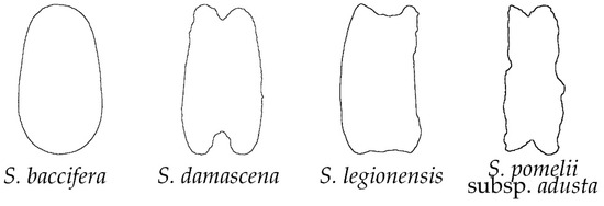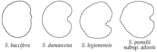 When compared to the individual silhouettes, the average silhouettes give a representation of the overall seed shape in the group of 20 seeds representing one species. The average silhouettes obtained for each group are shown in Appendix B (Figure A2, Figure A3, Figure A4 and Figure A5), and the results were rather coincident with those exposed for individual seed outline silhouettes in each morphological group. In the group of smooth seeds (Figure A2), the lateral views presented a notable concavity in the hilum region for S. damascena, S. legionensis and S. pomeli subsp. adusta but not in S. baccifera. In the dorsal views, the seeds of S. legionensis and S. baccifera were convex, while those of S. damascena and S. pomeli subsp. adusta present concavities in their upper and lower sides.
