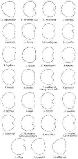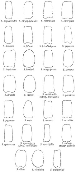 The proposed description of the lateral and dorsal views of Silene seeds was based on the consideration of the seed silhouettes as geometric figures. In relation to general seed shape, it allowed for comparing the seed outline with algebraically defined geometric figures providing a quantity, J index, that indicates the percentage of similarity of the seed silhouette with a given geometric figure taken as a model [7,29,30,31,32]. Related to seed coat ornamentation, and working specifically with seed silhouettes, we have analyzed recently 100 populations belonging to 49 species of Silene, one of Atocion and two of Viscaria [31]. The seeds were classified according to the outline of their silhouettes in three groups described as smooth, rugose or echinate [31]. These three morphological groups were related also to the subgeneric classification based on DNA sequence analysis [34]. The group of smooth seeds contained mainly species corresponding to S. subg. Silene, while species of S. subg. Lychnis were absent. Most of the species in the group of rugose seeds belonged to S. subg. Silene, and species in the group of echinate seeds corresponded mainly to both S. subg. Behenantha and S. subg. Lychnis [31].