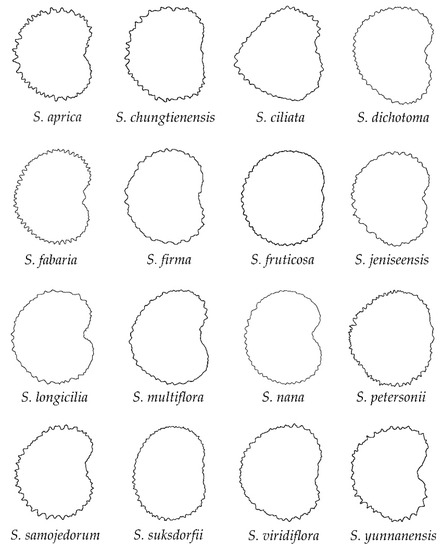 The seed individual outlines and their corresponding average silhouettes for the lateral and dorsal views of the seeds in each species were obtained from 20 representative seed images by the method described [29,38]. A video describing the method used is available at: https://zenodo.org/record/4478344#.YzxbmExBxD8 (accessed on 1 December 2022).