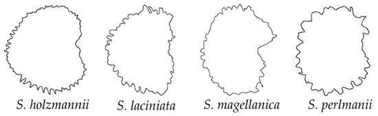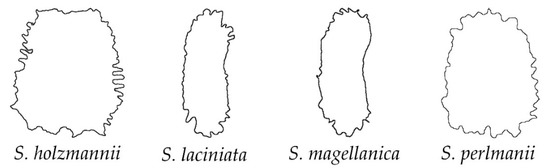 In addition, some species did not match with the previous groups, and another new category was defined as papillose (Figure 7 and Figure 8). The papillose seeds are characterized at their cell surface by longer and broader prolongations (papillae) than the spines of the echinate group. In addition, although some papillae can be acute, most of them are flat at their tips. Four species were included in this group of papillose seeds (Figure 7): S. holzmannii, S. laciniata, S. magellanica and S. perlmanii. Most of these species belong to S. subg. Behenantha (3 out of 4, 75%). Their dorsal silhouettes showed a rectangular shape, with the presence of marked prolongations (Figure 8).