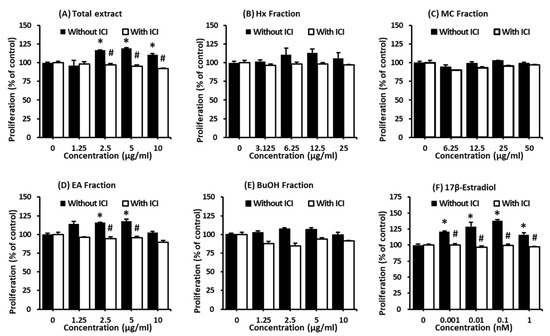 Comparison of the estrogenic activity of the (A) crude extract (total); (B) hexane (Hx), (C) CH2Cl2 (MC), (D) EtOAc (EA), and (E) n-BuOH (BuOH) fractions; and (F) 17β-estradiol in the absence or presence of ICI 182,780 according to the cell proliferation measured by E-screen assay in MCF-7 cells. * Significant difference between the cells treated with the extract or fractions and untreated cells. # Significant difference between the cells treated with ICI and without ICI at the same concentration of sample (n = 3 independent experiments, p < 0.05, Kruskal–Wallis non-parametric test). Data are represented as the mean ± standard error of the mean (SEM).