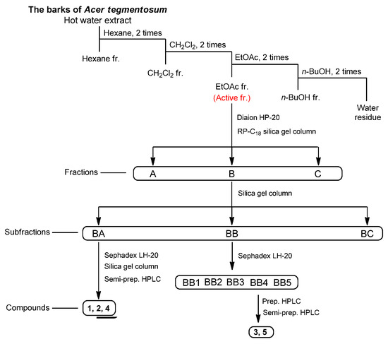 Isolation scheme of compounds 1–5 from the extract of Acer tegmentosum.