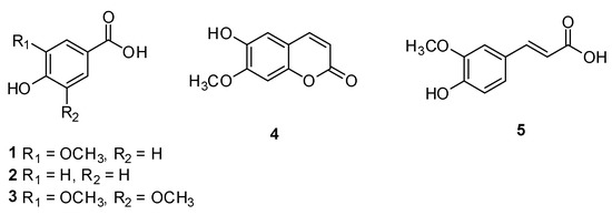Chemical structures of compounds 1–6: vanillic acid (1), 4-hydroxy-benzoic acid (2), syringic acid (3), isoscopoletin (4), and (E)-ferulic acid (5).