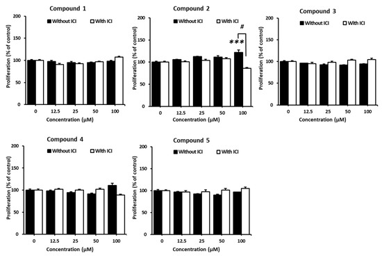 Estrogenic effects of the isolated compounds (1–5) in the presence or absence of ICI 182,780 measured by the E-screen assay on MCF-7 cells. Cell viability is expressed as the mean ± SEM. *** p < 0.001 compared to the non-treated group; # p < 0.05 compared to the ICI-treated group at the same concentration of samples. Data are represented as the mean ± SEM.