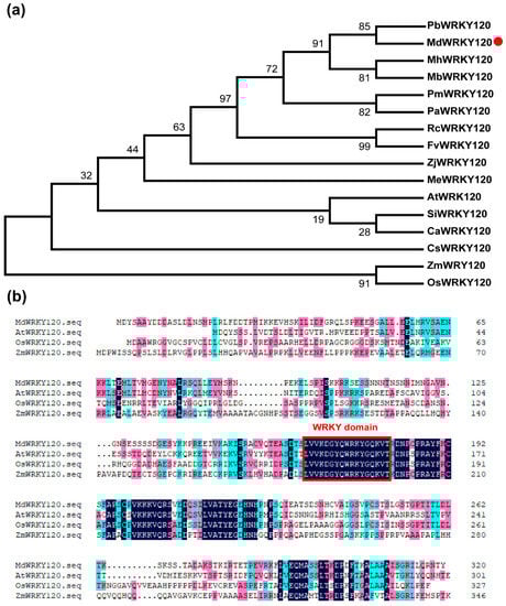 Phylogenetic alignment of MdWRKY120 homologous proteins. (a) The Phylogenetic tree of MdWRKY120. The red dot represents apple WRKY120. Pb, Pyrus bretschneideri; Md, Malus domestica; Mh, Malus hupehensis; Mb, Malus baccata; Pm, Prunus mume; Pa, Prunus armeniaca; Rc, Ricinus communis; Fv, Fragaria vesca; Zj, Ziziphus jujube; Me, Manihot esculenta; At, Arabidopsis thaliana; Si, Setaria italica; Ca, Coffea arabica; Cs, Camellia sinensis; Zm, Zea mays; Os, Oryza sativa. (b) Sequence alignment of MdWRKY120 amino acids.
