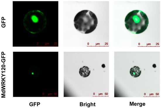 It was reported that most WRKYs were nucleus-localized proteins [20]. To elucidate whether MdWRKY120 was a nuclear protein like other WRKYs, the MdWRKY120 coding sequence was attached to the pRI-GFP via the CaMV 35S promoter, followed by transient expression of the MdWRKY120-GFP fusion gene in tobacco leaves. As indicated by Figure 3, the MdWRKY120-GFP fusion protein’s signals were limited to the nucleus, whereas the positive control GFP signals were expressed throughout the cell, proving that MdWRKY120 was localized in the nucleus and is thus a nuclear protein.