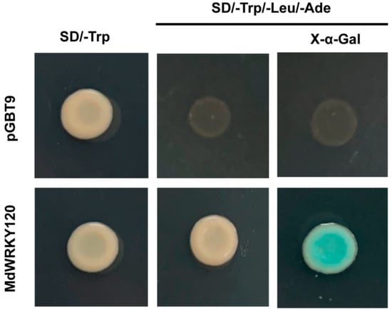 To analyze the transcriptional activity of MdWRKY120, the complete MdWRKY120 coding sequence was inserted into pGBT9 to obtain the pGBT9-MdWRKY120 construct, which was then transformed in the yeast cells. The empty pGBT9 vector was kept as the negative control. As Figure 4 indicates, the Y2H Gold yeast strain containing pGBT9 only propagated in SD/-Trp, while the yeast strain containing pGBT9-MdWRKY120 propagated in both SD/-Trp and SD/-Trp-His-Ade with X-α-Gal. The result indicated that MdWRKY120 was a transcription activator.