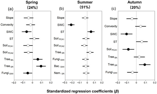 Standardized regression coefficients (β) of the biotic and abiotic predictors of soil respiration across a 25 ha forest dynamics plot in Northeast China, derived from multiple linear regression models for each season. The total R2 is given in parentheses for each model (See also Table S5). Closed circles indicate significant relationships with soil respiration at p < 0.05, and lines indicate standard errors. All abbreviations follow Table 1.