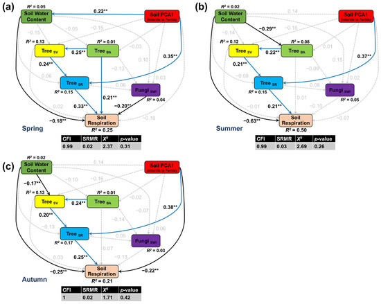 Structural equation models showing differences in soil respiration in spring (a), summer (b), and autumn (c) associated with soil moisture (soil water content), total soil elements (soil PCA1), plant biomass (TreeBA), stand structural complexity (TreeSV), plant diversity (TreeSR), and soil fungal diversity (FungiSWI). Blue and black solid arrows represent significant positive or negative paths, respectively, at p < 0.05 (** p < 0.05); grey dashed arrows indicate non-significant paths. Values adjacent to arrows represent standardized coefficients (see Table S6). All abbreviations follow Table 1.