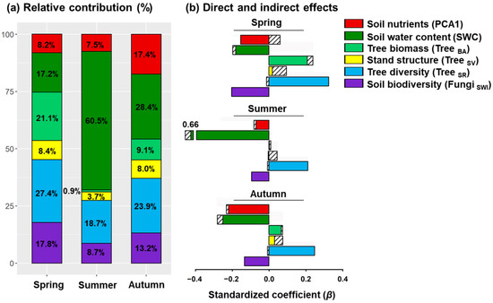 Relative contributions (a), and direct and indirect effects (b) of significant predictors to soil respiration rates in different seasons. Solid colours represent direct effects derived from structural equation models, whereas striped bars represent indirect effects (see also Table S6).
