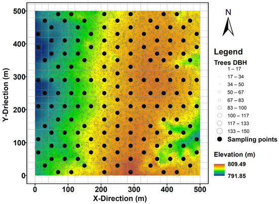 Contour map of the 25 ha Changbaishan Forest Dynamics Plot in Northeast China, showing the sampling points of soil respiration as solid circles and the positions of all living trees as open circles, whereby symbol sizes indicate tree diameter at breast height (DBH). Colours indicate differences in elevation.