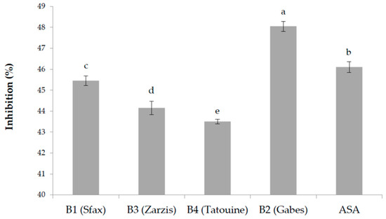 Anti-inflammatory activity of the different methanolic extracts (100 μg/mL) of the tested B. tournefortii plants, measured as an inhibitory effect of protein denaturation (%). Data are the mean of three replicates ± SD. Different superscript letters indicate significant differences between B. tournefortii growing regions at 5% according to the Duncan’s multiple range test and ANOVA test.