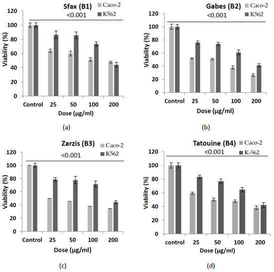 Antiproliferative activity of the four extracts of Brassica tournefortii growing in different regions of southern Tunisia, tested on two neoplastic cell lines (K-562 and Caco-2). (a) B. tournefortii samples collected from Sfax (B1); (b) B. tournefortii samples collected from Gabes (B2); (c) B. tournefortii samples collected from Zarzis (B3); (d) B. tournefortii samples collected from Tatouine (B4). Data are the mean of three replicates ± SD. The unpaired Student’s t-test indicates significant differences compared with the untreated cells (control) (p < 0.001).