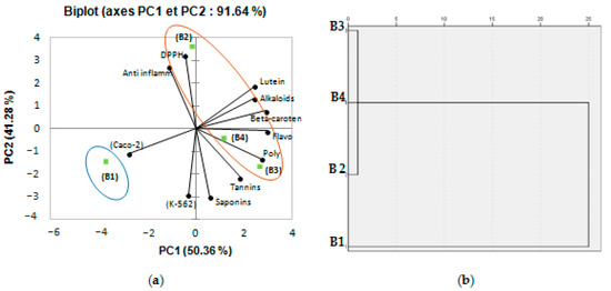 Biochemical composition and biological activities’ measurements of B. tournefortii populations collected from different geographical localities (representing different environmental conditions) have been investigated using PCA. Depending on this analysis, the axes of inertia had been withheld, as seen in Table 4. The structuring of accessions showed 91.64% of the total variation (Figure 3). The PCA loading plot shows, at the same time, how well the principal components correlate with the original variables, and the correlations between the different activities and the different bioactive components. The first principal component (PC 1) is strongly correlated with six of the original variables: polyphenols, flavonoids, β-carotene, lutein, alkaloids contents, and anticancer activity against Caco-2 with loading of 0.831, 0.983, 0.942, 0.667, 0.672, and 0.857, respectively. Moreover, the first principal component correlates most clearly with the flavonoids and β-carotene content (correlation level of 0.983 and 0.942). The second axis reflected an anti-inflammatory, antiproliferative activity against K-562, DPPH radical scavenging activity, and saponins content with loading of 0.698, 0.776, 0.972, and 0.838 (Table 4). Figure 3 showed a good correlation between DPPH radical scavenging activity, anti-inflammatory activity, and the different bioactive components: polyphenols, flavonoids, β-carotene, lutein, and alkaloids contents; this analysis confirms that the two activities are strictly correlated, chiefly through the measured bioactive components. Oval forms exhibited in Figure 3a clustered the different populations of B. tournefortii (four growing regions: B1: Sfax; B2: Gabes; B3: Zarzis; B4: Tatouine) into two classes. When cluster analysis is applied, a resulting discriminate structure is evident. The different populations of B. tournefortii resulted in being grouped into two main clusters (Figure 3b). The lofty correlation coefficient obtained from PCA analysis proposes that the geographical distribution is related with the accumulation of secondary metabolites among populations. Thus, the population located toward southern latitudes (B2, B3 and B4) showed a higher level of phenolics compared to the populations located in the northeast area (B1). Results presented in this work are in accordance with that of Del Valle et al. [24], who also found a similar trend for Silene littorea populations.