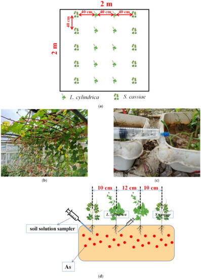 At present, the research on whether L. cylindrica is planted on As-contaminated land and achieves safe production is relatively rare. S. cassiae belongs to leguminous plant, and when it is intercropped with L. cylindrica, it may provide more N elements for L. cylindrica [], thus promoting the growth of L. cylindrica. In addition, S. cassiae has a high As enrichment capacity. When it is intercropped with L. cylindrica, it may reduce the As absorption of L. cylindrica. On the other hand, even if the As concentration of S. cassiae fruit exceeds the edible standard, it can also be used to produce pillows or other products, thus producing certain economic benefits. Some photos of the research are shown in Figure 1. Thus, in our study, L. cylindrica and S. cassiae were selected for planting experiments on land contaminated with As to identify an intercropping model that can achieve safe production on As-contaminated land and remove As from the soil to a certain extent. We hypothesized the following: (1) intercropping with S. cassiae would reduce the content of As in L. cylindrica; (2) intercropping with L. cylindrica would promote the absorption of As by S. cassiae to an extent; and (3) this intercropping system would primarily affect the absorption of As by L. cylindrica and S. cassiae by changing the concentration of water soluble As in the rhizosphere environment of plants.