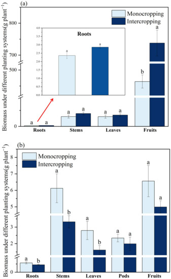 The biomass of all parts of L. cylindrica increased in the intercropping system compared with the monoculture system, but only the increase in the fruit biomass was significantly different, which increased by 59.04% compared with the monoculture mode (p < 0.05) (Figure 2a).
