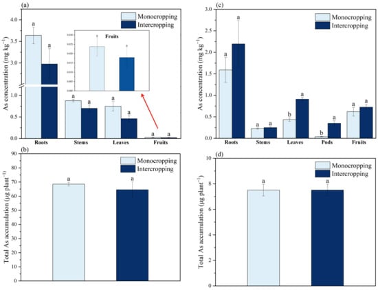 Intercropping is a common planting method that can fully utilize water, heat, light, and other natural resources [,,]. Some suitable intercropping systems can improve the land use efficiency and promote the absorption of nutrients by plants, such as the Pisum sativum-Hordeum vulgare intercropping system [], Solanum tuberosum-Phaseolus lunatus intercropping system [], and corn–groundnut intercropping system []. In terms of soil heavy metal remediation, choosing suitable plants for intercropping can ensure the production of safe edible crops on land contaminated with As and improve the phytoremediation of this soil. For example, Huang et al. [] found that the As in rice (Oryza sativa L.) grains can be reduced to below the National Food Safety Standard of China (GB2762-2017) when the rice was intercropped with aquatic vegetables. Wan et al. [] showed that the intercropping of white mulberry (Morus alba L.) with Chinese brake (Pteris vittata L.) resulted in white mulberry leaves that can meet the national feed standards. Ma et al. [] also found that the intercropping of P. vittata and maize (Zea mays L.) is an ideal planting mode for remediating As in the soil. In addition, intercropping Eleocharis acutangula with Typha domingensis can remove barium from soil [], and Paspalum plicatulum–Axonopus affinis [] and Lolium perenne–vine plants [] are also intercropping systems that can repair copper-contaminated soil. However, owing to the existence of As phytoremediation plants, these common intercropping models often produce limited economic benefits, which is difficult for meeting the needs of most farmers. Therefore, it is necessary to find an intercropping mode that can produce safe products without increasing environmental risks [].