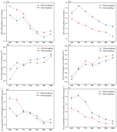 The pH of the rhizosphere soil solution in the monoculture system of S. cassiae decreased from 5.43 to 3.73, while that in the intercropping system decreased from 6.02 to 4.65 (Figure 4d). The Eh of S. cassiae in the rhizosphere soil solution in the monoculture system increased from 264.0 mV to 360.0 mV, whereas that of the rhizosphere soil solution of S. cassiae in the intercropping system increased from 251.5 mV to 348.0 mV (Figure 4e). The concentration of As in the rhizosphere soil solution of S. cassiae in the monoculture system decreased from 22.33 μg kg−1 to 12.18 μg kg−1, while that in the intercropping system decreased from 29.04 μg kg−1 to 13.80 μg kg−1 (Figure 4f). During the entire sampling period, the intercropping mode decreased the As content of the rhizosphere soil solution for S. cassiae compared with the monocropping system, with a range of decrease of 13.30–59.40%.