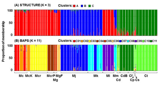 - Evanno, G.; Regnaut, S.; Goudet, J. Detecting the number of clusters of individuals using the software structure: A simulation study. Mol. Ecol. 2005, 14, 2611–2620. [Google Scholar] [CrossRef]