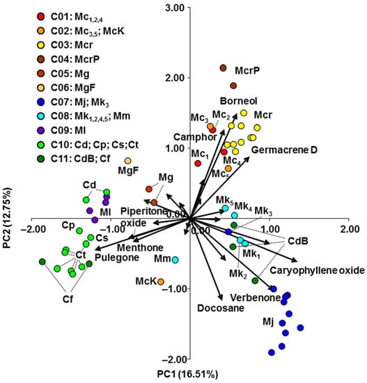 Principal component analysis (PCA) was based on 21 significant constituents of the EO. PCA was performed using the PRINCOMP procedure in SAS v9.3 (SAS Institute Inc., Cary, NC, USA) [89], and the biplot showing the populations and oil constituents (as vectors) was constructed using the first two principal components.