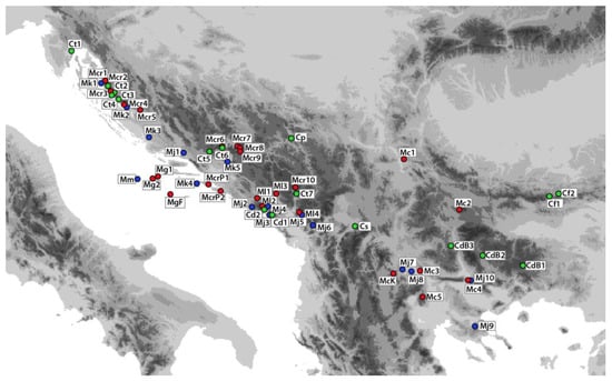 Collection sites of studied Micromeria and Clinopodium taxa: Mc, M. cristata ssp. cristata; McK, M. cristata ssp. kosaninii; Mcr, M. croatica including the former M. pseudocroatica, McrP; Mg, M. graeca ssp. graeca; MgF, M. graeca ssp. fruticulosa; Mj, M. juliana; Mk, M. kerneri; Ml, M. longipedunculata; Mm, M. microphylla; Cd, C. dalmaticum including the former M. bulgarica, CdB; Cf, C. frivaldszkyanum; Cp, C. pulegium; Cs, C. serpyllifolium; Ct, C. thymifolium. Three genetic groups determined by STRUCTURE were marked using the same colours (blue, green, red).