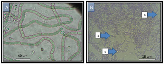 The two isolated cyanobacteria identified based on their morphological characteristics. (A) Anabaena oryzae with thallus green, which is gelatinous and memberanous. Trichomes are short and straight. Cells are barrel-shaped, the same length as it is broad, 4 μm broad, 5 μm long. Heterocysts are terminal and intercalary; intercalary heterocysts are subspherical, are 4–5 μm broad, and are 4–5 μm long; terminal heterocysts are conical and longer than they are broad, are 3–3.5 μm broad, and are 4–4.5 μm long. There are 3–6 akinetes in a series, and they are sub-spherical, are 5–6 μm broad, and are 6–7 μm long. (B) The Nostoc muscorum culture has dark green trichomes and no ramifications. It was uniseriate, single, aggregated, and showed neither polarity nor tapering. No sheath was formed. Trichomes are composed of three sizes and shapes of cells; (a) barrel cells (5–6 × 5.5–7 μm); (b) granular, ellipsoidal cells (5 × 5.5–7.5 μm); (c) yellowish-brown rounded cells of 8.9 μm in diameter. Few heterocysts were observed. They were of a single occurrence with two position, intercalary and terminal.