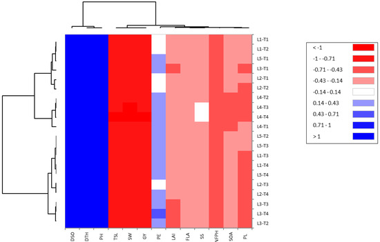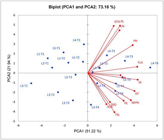 A robust positive relationship among the evaluated floral, growth, and yield traits and T4 were associated on the positive side of the PC1, in particular for L2, L1, and L5 lines, which indicates the high performance of these lines under T4 treatment in comparison with other treatments. On the contrary, the untreated CMS lines with cyanobacteria (control/T1 treatment), located on the opposite side, presented lower evaluated traits. Otherwise, both T2 and T3 existed between T1 and T4, presenting a slightly positive impact on the evaluated traits. The traits of floral, growth, and yield showed a highly significant positive inter-association by adjacent vectors, except for the following traits: flag leaf angle (FLA), plant height (PH), leaf area index (LAI), panicle length (PL), and days to heading (DTH). The traits SOA, DSO, and TSL were determined to be on the PCA2 positive side, while FLA and LAI existed on the negative side, which indicates a negative correlation between these traits.