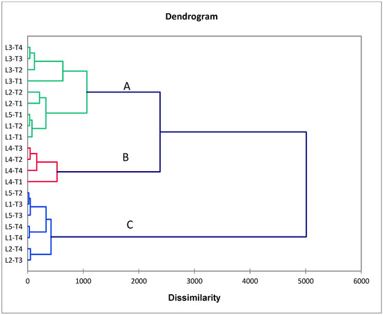 Results depicted by the correlation heatmap divided the measured bacterial treatments and CMS lines into two main groups based on the evaluated traits, as shown in Figure 3. Treatments T3 and T4 were grouped together, whereas T1 and T2 were located in another cluster. A strong positive and significant association was detected among the duration of spikelet opening (DSO), days to heading (DTH), and plant height (PH). L3-T4 was considered the best value in panicle exertion (PE). Otherwise, a significant relationship was determined between total stigma length (TSL), stigma width (SW) and grain yield (GY) in the evaluated lines under bacterial treatments. On the other hand, the agglomerative hierarchical clustering (AHC) separated CMS lines with cyanobacteria treatments into three clusters (Figure 4). One cluster (cluster C) contained T3 and T4, while T1 and T2 located in cluster A.