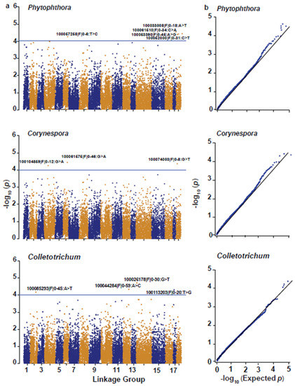 | Pathogen Associated with the Disease Trait | Linkage Group | Marker | Reference Genome Sequence | Physical Position (bp) | −Log10 (p) | R2 (%) (Variance Explained) | Allele Effect | |