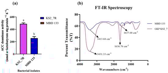 (a) Quantitative estimation of ACC deaminase activity; (b) FTIR spectra of α-ketobutyrate in the strains. GKP KS2_7 (Pseudomonas aeruginosa) and MBD 133 (Bacillus subtilis). Values are the mean of three replicates. Mean ± standard error (SE) is indicated by error bars. Statistical significance is indicated by differences in letters between treatments (unpaired t-test, two-tailed at p < 0.05). A different letter is an indication of a significant difference, indicating the significance between them.