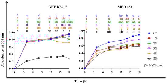 Growth curve analysis of bacterial strains under different salt concentrations. CT—no salt inoculation; GKP KS2_7 (Pseudomonas aeruginosa) and MBD 133 (Bacillus subtilis)—Bacterial treatments; 1-, 2-, 3-, 4-, and 5%—different NaCl concentration. Values are the mean of three replicates. Mean ± standard error (SE) is indicated by error bars. Statistical significance is indicated by differences in letters between treatments (Two-way ANOVA, Tukey’s multiple comparison test p < 0.05). A different letter is an indication of a significant difference, indicating the significance between them.
