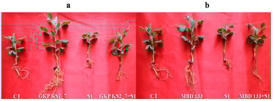 Effect of acdS+ PGPR strains on Pisum sativum growth under normal and 1% NaCl induced salinity stress after 25 DAS. (a) CT—control without bacterial inoculants and salt; GKP KS2_7—Pseudomonas aeruginosa; Bacterial treated—GKP KS2_7+S1; S1—1% NaCl; (b) CT—control without bacterial inoculants and salt; MBD 133—Bacillus subtilis; Bacterial treated; MBD 133+S1—PGPR+NaCl; S1—1% NaCl.
