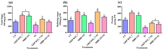 The biochemical parameters such as TSS, RS, and protein content were measured to examine the effect of these ST-PGPR on plant growth. In contrast to control (normal soil) conditions, plants that are treated with the GKP KS2_7 and MBD 133 strains did not suffer NaCl-induced salinity stress, thereby resulting in improved growth (Figure 4a–c).