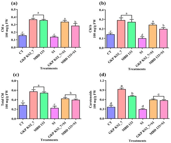 The presence of inoculated plants with P. aeruginosa GKP KS2_7 and B. subtilis MBD 133 considerably increased the levels of photosynthetic pigments (Figure 5a–d). Plants inoculated with GKP KS2_7 strain under NaCl-induced stress conditions produced higher levels of photosynthetic pigments than non-inoculated plants. However, as compared to the control, 1% saline stress caused a reduction in photosynthetic pigments (Figure 5a–d).