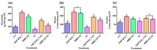 Effect of potent ACCD strains on non-enzymatic antioxidant activities in P. sativum under salinity stress. (a) Flavonoids content; (b) Phenols content; and (c) Proline contents. CT—Control (unbacterized seeds); plants inoculated with GKP KS2_7 and MBD 133—ACCD producing bacterial isolates; S1—1% NaCl concentration; GKP KS2_7+S1 and MBD 133+S1—Bacteria+NaCl. Values are the mean of three replicates mean ± standard error (SE). Statistical significance is indicated by differences in letters between treatments (One-way ANOVA, Tukey’s multiple range test p < 0.05). Similar letters represent no significance, while a different letter is indicative of a significant difference indicating the significance between them.