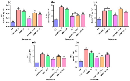 Antioxidant enzyme activities in pea leaves with or without salt and bacterial inoculation. (a) superoxide dismutase (SOD) activity; (b) Catalase (CAT) activity; (c) Peroxidases (POD) activity; and (d) Ascorbate peroxidase (APX) activity; (e) Lipid peroxidase (LPX) activity. Positive CT—Control without bacterial treatment; plants inoculated with GKP KS2_7 and MBD 133—acdS+ bacterial isolates; Negative control: S1—1% NaCl concentration; GKP KS2_7+S1 and MBD 133 + S1 – PGPR + NaCl. Data are expressed as a mean of three replicates mean ± standard error (SE). Statistical significance is indicated by differences in letters between treatments (One-way ANOVA, Tukey’s multiple range test p < 0.05). Similar letters represent no significance, while a different letter is indicative of a significant difference indicating the significance between them.
