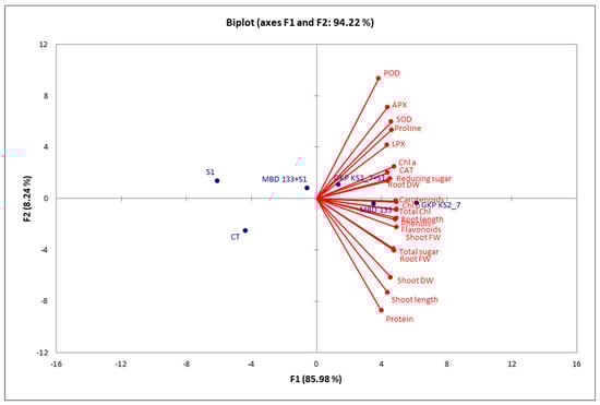 The bi-plots correlation analysis revealed that the P. aeruginosa GKP KS2_7 strain showed a positive correlation between different variables, such as the effect on morphological, biochemical as well as enzymatic parameters in P. sativum under salinity stress conditions (Figure 8). The correlation between traits is indicated by red and blue dots, which represent the correlation between treatments. There was a very strong and positive correlation between variables in the same quadrant that were extremely close together. The combined correlation bi-plot between F1 and F2 revealed a 94.22% variation in which F1 contributed 85.98% and 08.24% for F2. Several significant positive correlations (alpha = 0.05) were found between root and shoot length; root and shoot fresh and dry weight; chlorophylls and carotenoids; TSS, RS, and protein contents; as well as antioxidants enzymes such as POD, APX, SOD, proline, LPX, CAT, phenols, and flavonoids (Figure 8). On the contrary, CT, S1, and MBD 133+S1 were negatively correlated with all other variables. A significant increase in these attributes is directly correlated with an increase in plant biomass yield (Figure 8).
