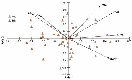 Results of PCA based on the characteristics of infructescences from the main stem and infructescences from the branch stem. MS—main stem; BS—branch stem; TNA—total number of achenes; ACE—number of achenes containing a developed embryo; EA—number of empty achenes; SACE—percent share of achenes containing a developed embryo; RA—receptacle area; AD—achene density.