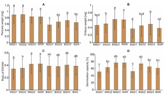 The two-way ANOVA results showed a statistically significant impact of the achene position of the infructescence on the plant on the pericarp weight (PW) (Table 3) and on the embryo weight/achene weight (EW/AW) ratio. In turn, the achene position within the infructescence determined the embryo weight (EW), germination capacity (G), and EW/AW. The interaction of the analyzed factors was confirmed in the case of PW and G.