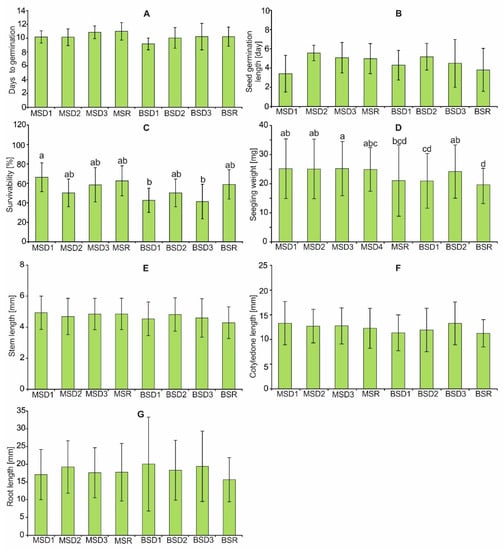 Days to germination, length of germination, and survival (A–C) and seedling measurements (D–G) of the four positions of achenes within the infructescence and the two positions of the infructescence on the plant. MS—main stem; BS—branch stem; D1–D3—achenes produced by disc florets; R—achenes produced by ray florets. Different lowercase letters indicate significant differences according to the U Mann–Whitney test (p < 0.05).