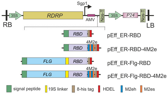 Scheme of the expression vectors. RDRP, RNA-dependent RNA polymerase gene; Sgp1, the first promoter of subgenomic RNA of PVX; AMV, translational enhancer from alfalfa mosaic virus; 35S, promoter of the cauliflower mosaic virus RNA; Nos-T, terminator of the A. tumefaciens nopaline synthase gene; P24, suppressor of silencing from grapevine leafroll-associated virus-2; Flg, flagellin of S. typhimurium; RBD, the sequence of receptor-binding domain of SARS-CoV-2; 4M2e, the sequence of four tandem copies of M2e peptide; SP, signal peptide; HDEL, ER retention signal; RB and LB, the right and left borders of T-DNA region.