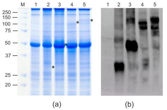 Expression of recombinant proteins in N. benthamiana plants. Coomassie brilliant blue-stained gel (a) and Western blotting with antibodies against RBD (b) of proteins isolated from plants. M, molecular weight marker (kD); Lanes: 1, total proteins isolated from the non-infiltrated leaf; 2, total proteins isolated from leaf infiltrated with pEff_ER-RBD; 3, total proteins isolated from leaf infiltrated with pEff_ER-RBD-4M2e; 4, total proteins isolated from leaf infiltrated with pEff_ER-Flg-RBD; 5, total proteins isolated from leaf infiltrated with pEff_ER-Flg-RBD-4M2e. Positions of RBD (calculated molecular weight 30 kD), RBD-4M2e (43 kD), Flg-RBD (83 kD), and Flg-RBD-4M2e (95 kD) proteins are shown by asterisks.