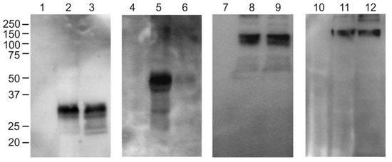 Analysis of the solubility of recombinant proteins expressed in N. benthamiana. Lanes: 1, 4, 7, 10, total proteins isolated from non-infiltrated leaves; 2, total proteins from leaf infiltrated with pEff_ER-RBD; 3, soluble proteins from leaf infiltrated with pEff_ER-RBD; 5, total proteins from leaf infiltrated with pEff_ER-RBD-4M2e; 6, soluble proteins from leaf infiltrated with pEff_ER-RBD-4M2e; 8, total proteins from leaf infiltrated with pEff_ER-Flg-RBD; 9, soluble proteins from leaf infiltrated with pEff_ER-Flg-RBD; 11, total proteins from leaf infiltrated with pEff_ER-Flg-RBD-4M2e; 12, soluble proteins from leaf infiltrated with pEff_ER-Flg-RBD-4M2e. Western blotting was performed with antibodies against RBD (lanes 1–6) or flagellin (lanes 7–12).